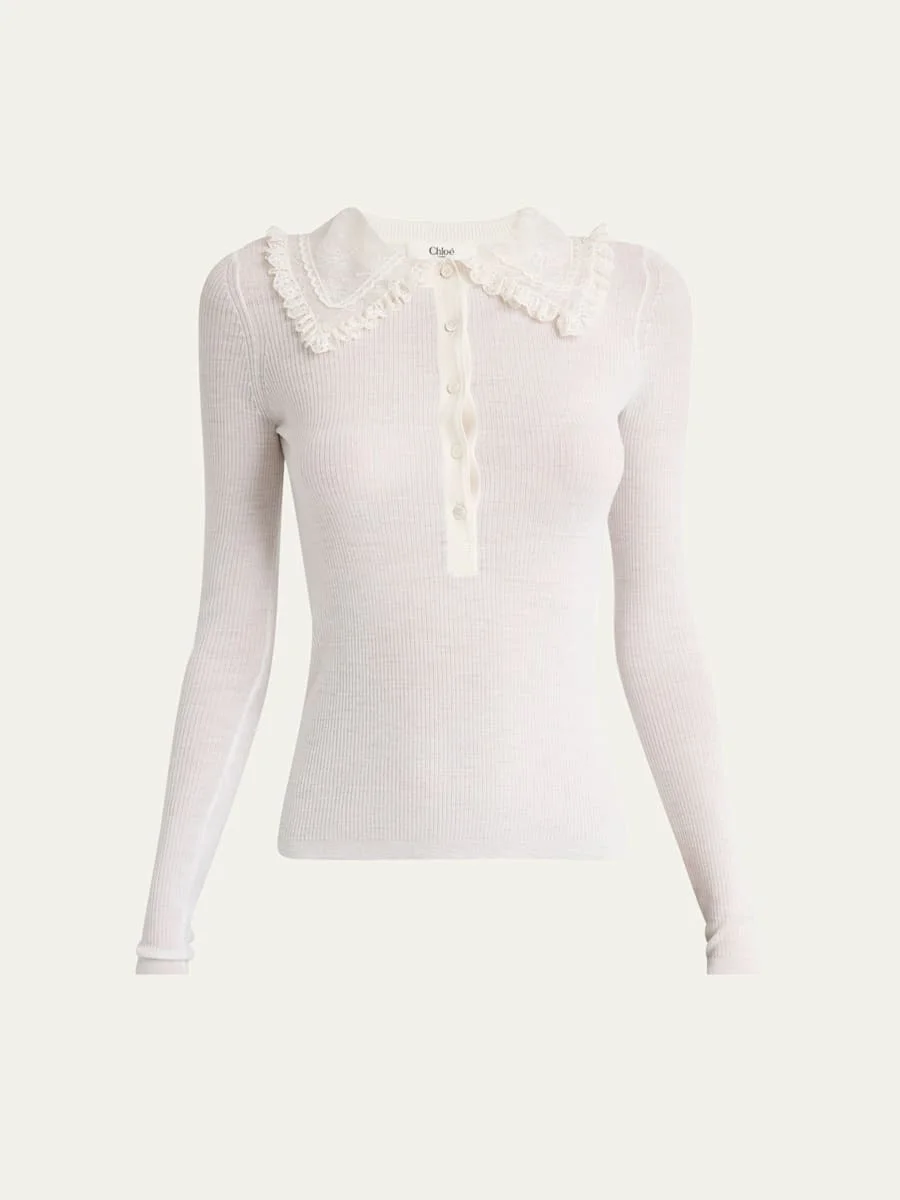 Chloe superfine ribbed knit top featuring a lace ruffle collar Spread collar; half button front Long sleeves Fitted Pullover style Wool/nylon/polyamide/polyester Dry clean Imported Online Inquiries: BGS21_BA88T| Store Inquiries: #5051257