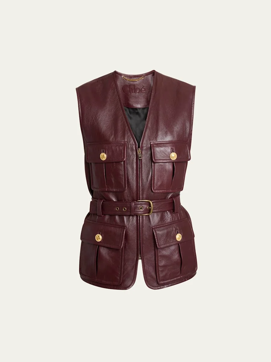 Chloe lambskin leather slouch vest featuring front button flap pockets and a self belt V neckline Sleeveless Belted waist Slim fit Zip closure Leather Lining: Viscose/cotton Dry clean Made in Italy Online Inquiries: BGS21_BA882| Store Inquiries: #5051229