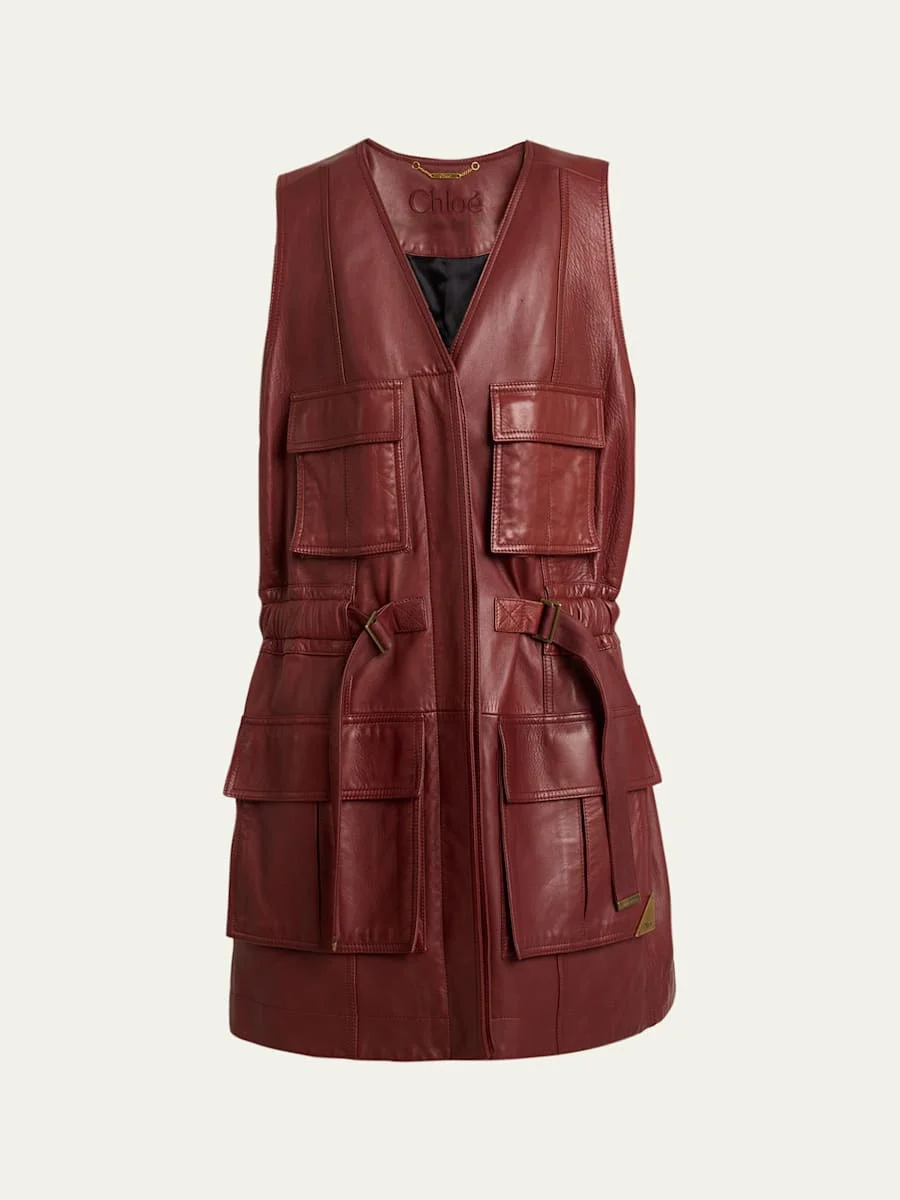 Chloe utilitarian vest in plonge classic lambskin leather with an integrated belt finished with gold-tone metal tips Gold metal Chloe logo triangle signs the left pocket V neckline; hidden button placket Sleeveless Oversized flap pockets Straight fit Lining: Viscose/cotton Made in Italy Online Inquiries: BGS21_B9WZF| Store Inquiries: #4991552