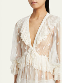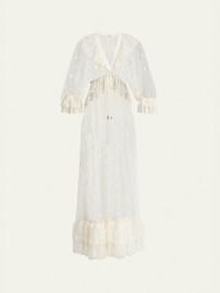 Chloe gathered dress in embroidered lace and ruffle-trim Drawstring ties at the waist and cuffs, finished with gold-tone tips Separate dress lining V neckline; button front Three-quarter sleeves Full length Polyester/silk Lining: Acetate/silk Imported Online Inquiries: BGS21_B9VTL| Store Inquiries: #4984412