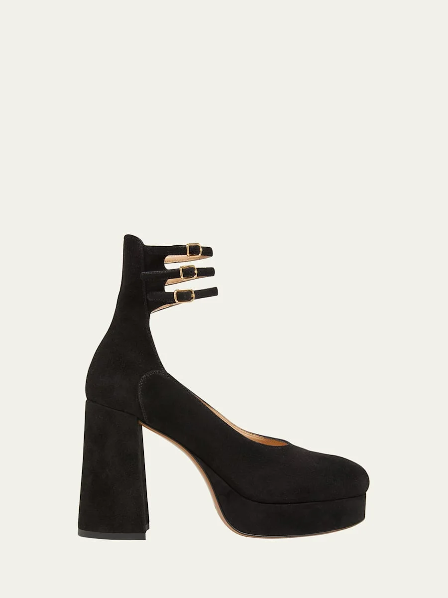 Designed in supple suede, the "Loti" pumps by Chloe are crafted with a striking platform base that elongates the leg while ensuring comfort and stability 4.00 in / 100 mm covered block heel Rounded toe softens the shape Three logo-engraved slim buckle straps Professional cleaning recommended Made in Italy Online Inquiries: BGS21_X747X| Store Inquiries: #5178752