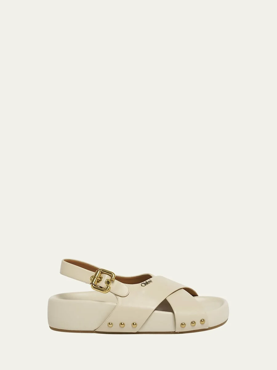 Chloe "Mae" Paddington slingback sandals in calfskin leather with goldtone stud accents Flat heel Open toe Crisscross camp Adjustable slingback strap Molded footbed Lightweight, sturdy TPU outsole Lining: Leather Professional cleaning recommended Made in Spain Online Inquiries: BGS21_X6W93| Store Inquiries: #5016973