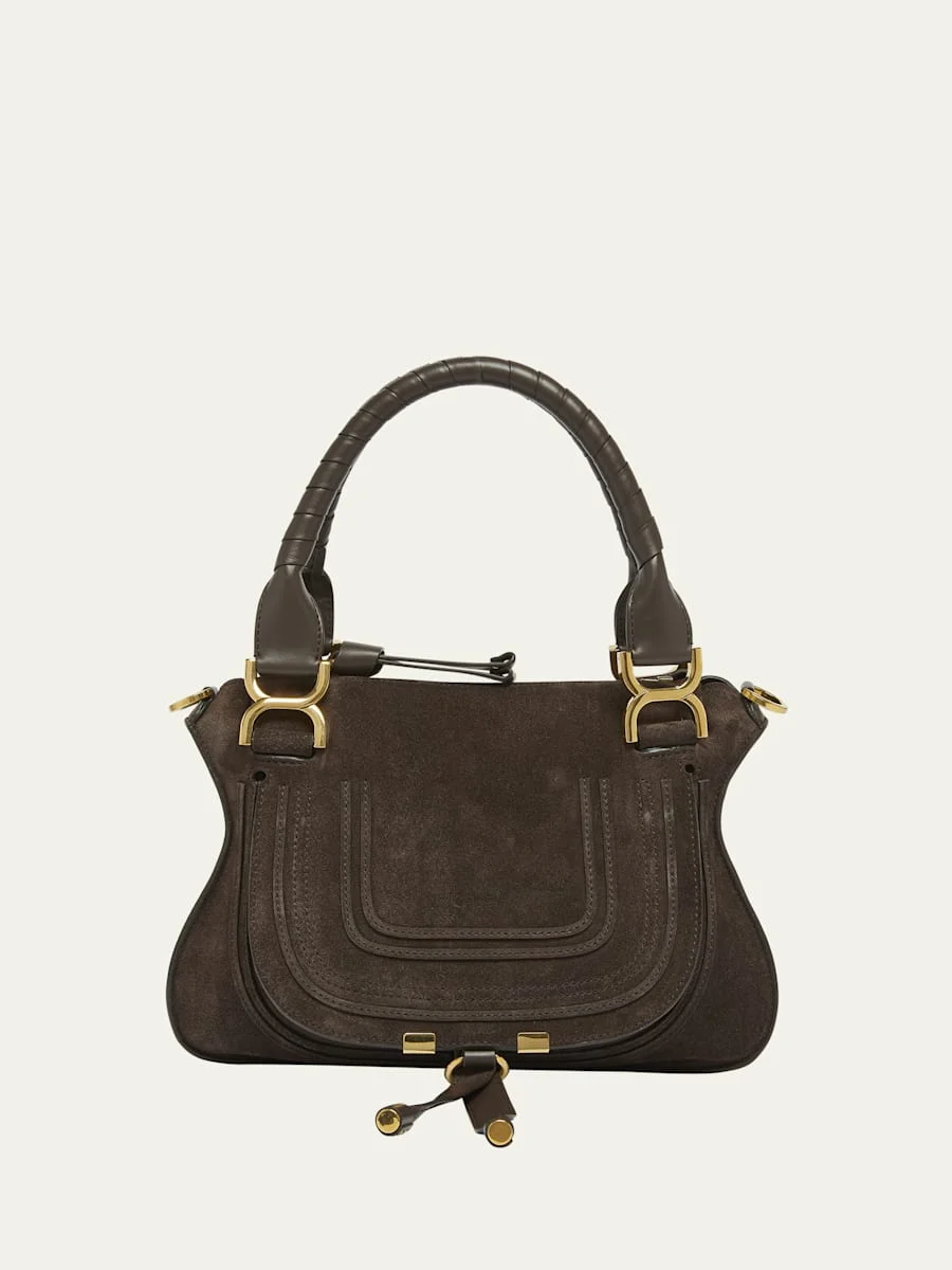 Chloe "Marcie" satchel bag in calfskin suede Rolled top handles Detachable, adjustable crossbody strap Can be worn as a top handle or crossbody bag Zip top closure Exterior, front flap with leather straps Interior, one zip pocket Lining: Leather Approx. 6.7"H x 7.1"W x 3.9"D Professional cleaning recommended Made in Italy Online Inquiries: BGS21_V6JEJ| Store Inquiries: #5015118
