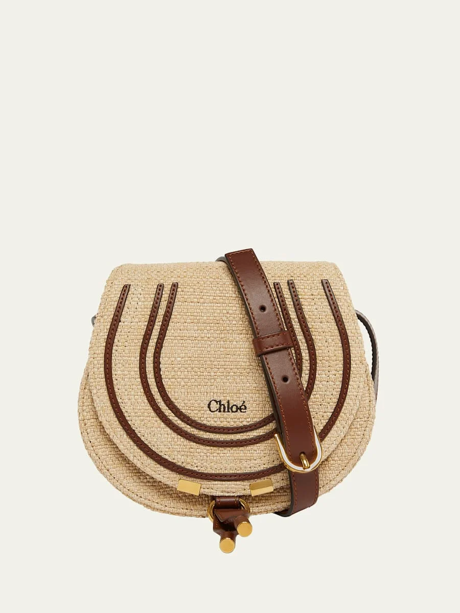 Chloe's "Marcie" crossbody bag, crafted from raffia-like fabric and leather, offers a chic saddle-structured silhouette Adjustable crossbody strap Flap top with leather strap loops through a metal ring Exterior, one slip pocket under flap Interior, one slip pocket Lining: Suede Approx. 9"H x 11.8"W x 0.4"D Made in Italy Online Inquiries: BGS21_V6GEX| Store Inquiries: #4980840