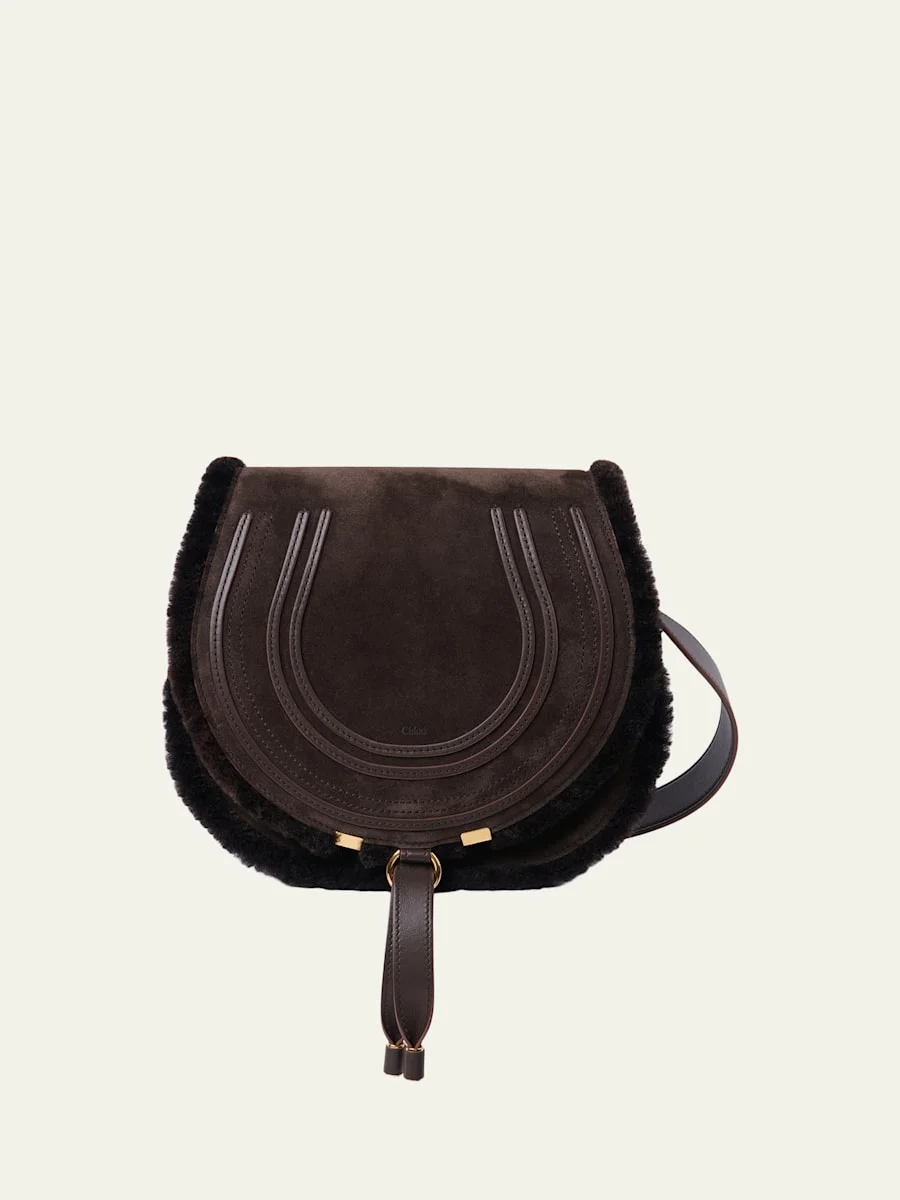 This "Marcie" crossbody bag from Chloe is designed in smooth suede with soft natural/dyed shearling (Italy) trim and iconic saddle stitching Adjustable crossbody strap Flap top with dangling leather tassel closure Interior, one slip pocket, one card slot Approx. 8"H x 10.4"W x 5.3"D Made in Italy Online Inquiries: BGS21_V6RJE| Store Inquiries: #5373128