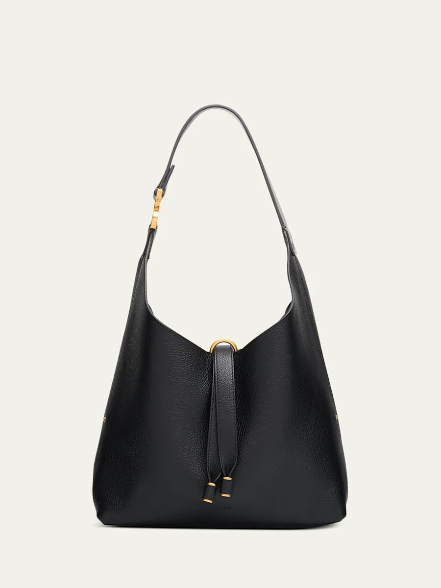 Chloe "Marcie" hobo bag in grained calfskin leather Shoulder strap Open top with center leather strap closure Interior, one zip pocket Lining: Leather Approx. 8.2"H x 11.4"W x 1.9"D Made in Italy