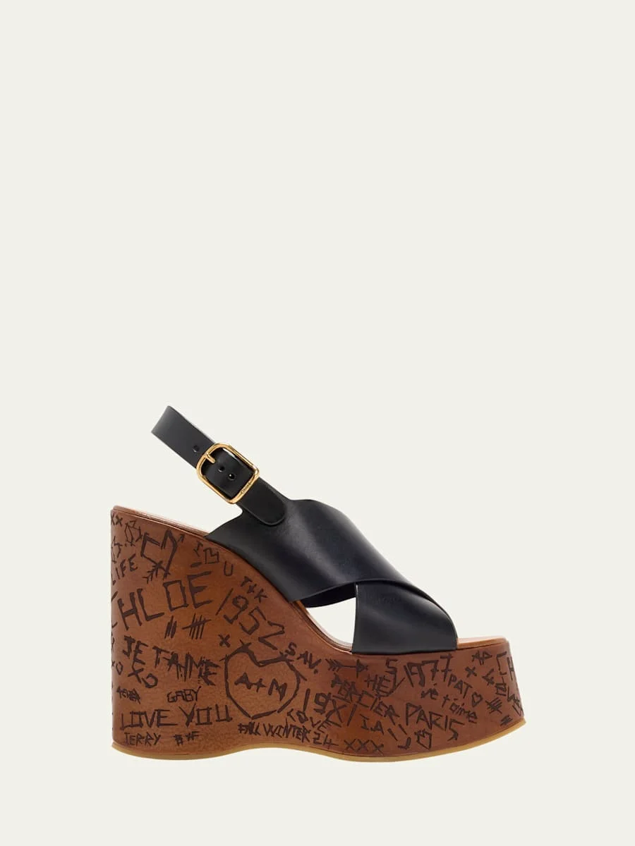 Chloe "Maxime" smooth leather platform sandals 5.25 in / 130 mm logo etched wedge heel; 2.00 in / 50 mm platform Open toe Crisscross vamp Adjustable slingback strap Polyurethane outsole Lining: Leather Professional cleaning recommended Made in Italy Online Inquiries: BGS21_X6LUX| Store Inquiries: #4807255
