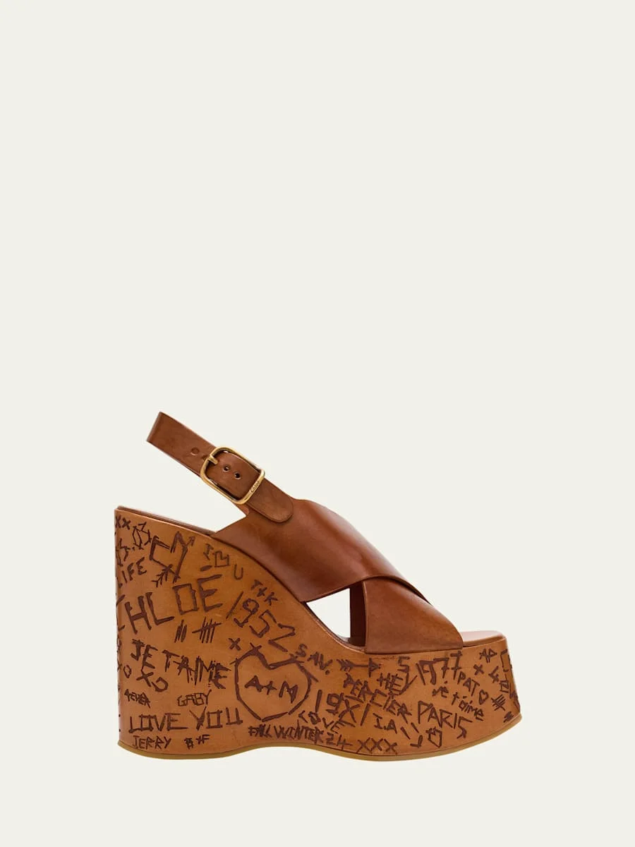 Chloe "Maxime" smooth leather platform sandals 5.25 in / 130 mm logo etched wedge heel; 2.00 in / 50 mm platform Open toe Crisscross vamp Adjustable slingback strap Polyurethane outsole Lining: Leather Professional cleaning recommended Made in Italy