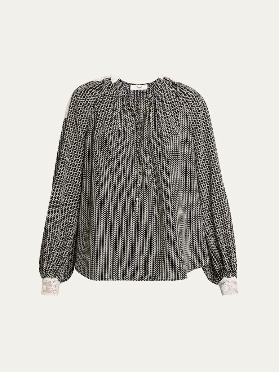 Chloe blouse featuring a micro check print, gathered neck, and lace-trimmed shoulders and cuffs Round neckline; self-tie keyhole front Long blouson sleeves; button cuffs Loose fit Silk/polyester Dry clean Made in France Online Inquiries: BGS21_BA3CB| Store Inquiries: #5024468