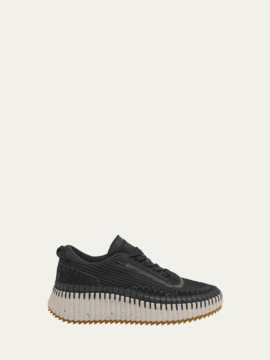 Chloe "Nama" lowtop walking sneakers in polyester, nylon, and cotton with leather and topstitch trim Fit: Whole sizes only; for 1/2 sizes, order next size up Flat molded heel Round toe Laceup vamp Rubber outsole Lining: Polyester Imported