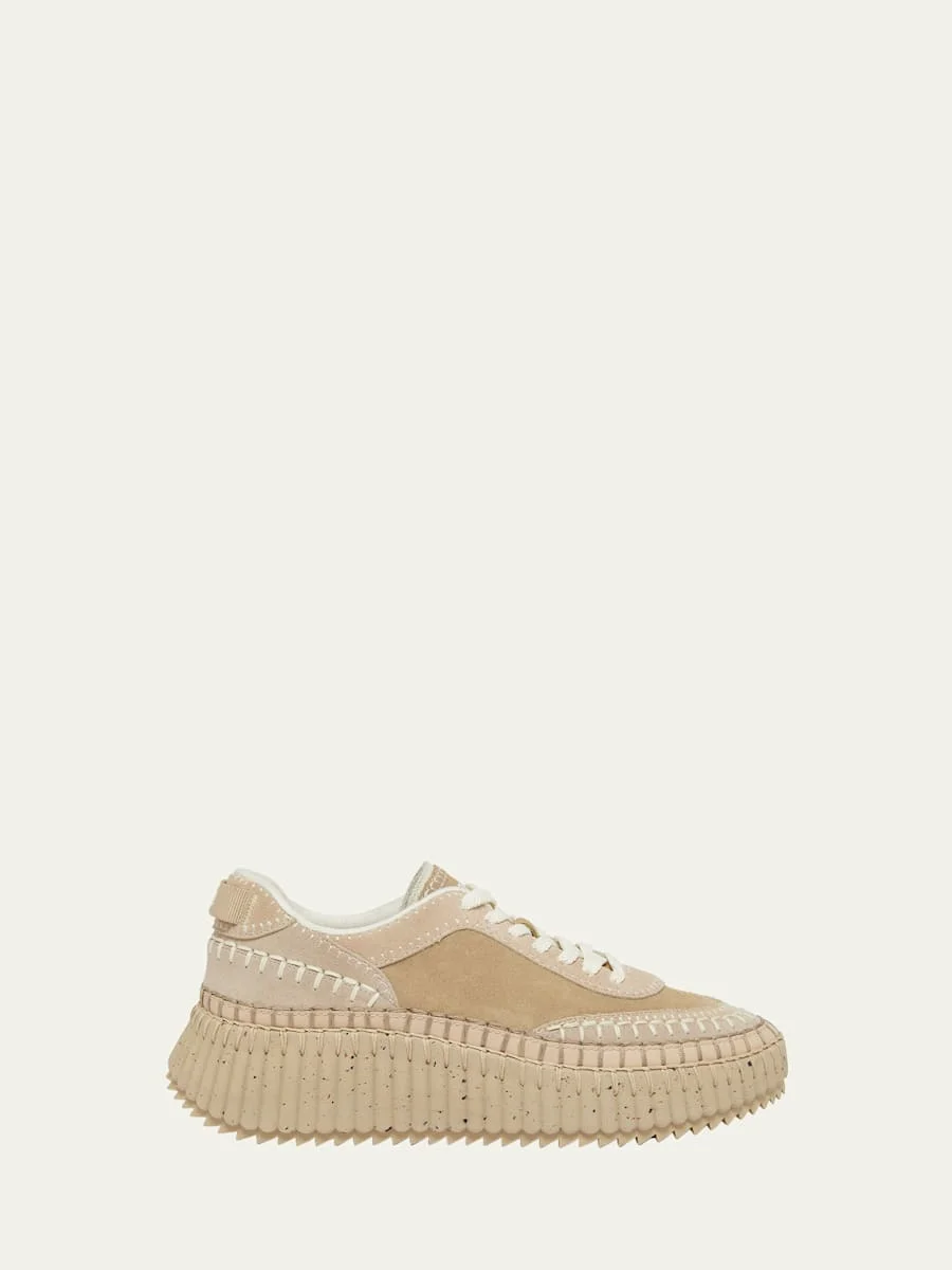 Chloe "Nama" low-top, stitch-detailed suede and leather walking sneakers. 2.25 in / 55 mm chunky heel; 1.25 in / 30 mm platform. Round toe. Lace-up vamp. Padded footbed. Rubber outsole. Lining: Polyester. Professional cleaning recommended. Imported. Online Inquiries: BGS21_X6WFB| Store Inquiries: #4807264
