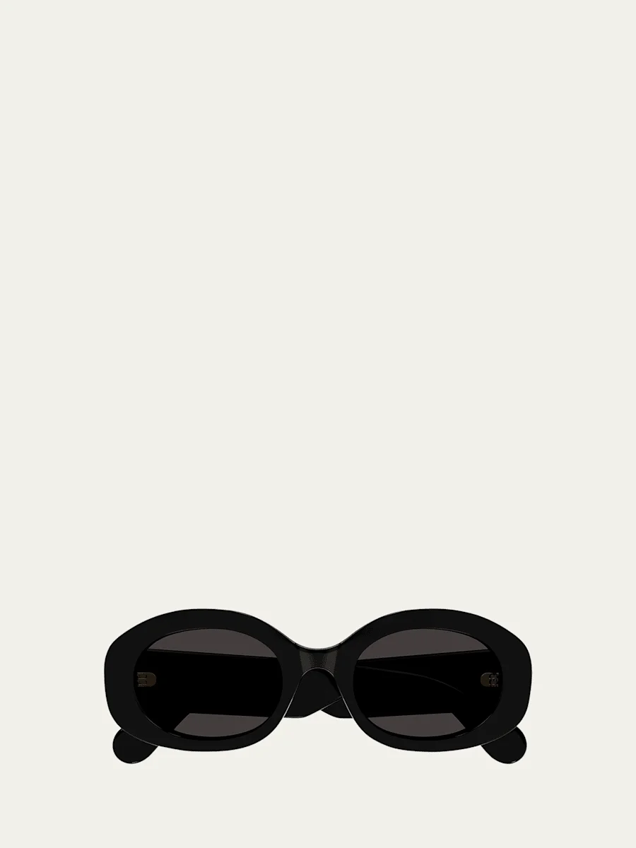 Chloe "Naomy" oval sunglasses in acetate Eye/bridge/temple (in mm): 53-22-145 Solid lenses in bio-based nylon Saddle nose bridge Contrasting logo on the left temple Wide, tapered arms 100% UVA/UVB protection Made in Italy Proposition 65 warning for California residents Online Inquiries: BGS21_D50ZD| Store Inquiries: #4874200
