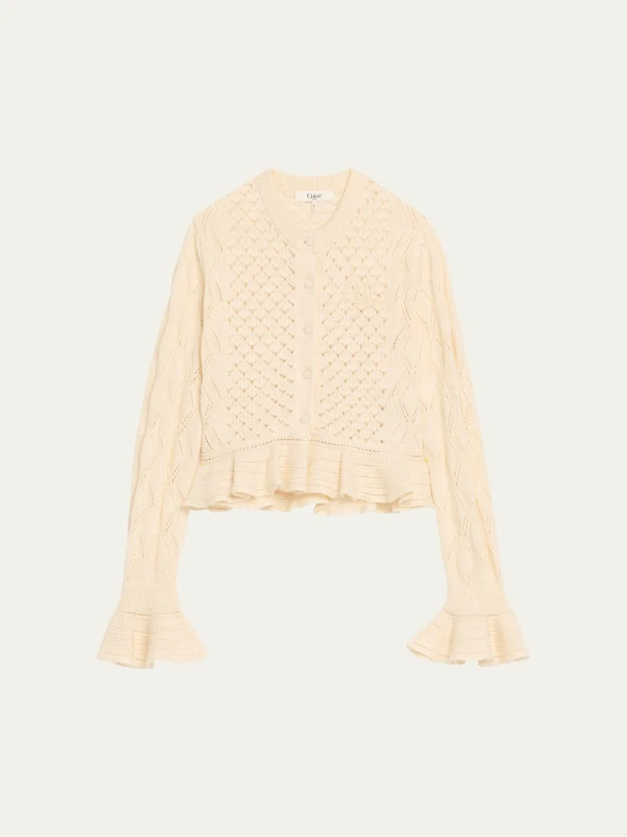 Chloe open knit work cardigan fetauring ruffle cuffs and hem Crew neckline; button front Long sleeves Fitted Hip length Nylon/polyamide/elastane Lining: Nylon/elastane Dry clean Made in Italy Online Inquiries: BGS21_BA3CG| Store Inquiries: #5024473