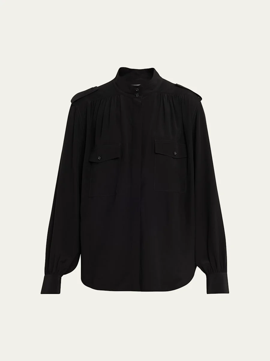Fluid and freespirited, this Chloe blouson top in organic silk crepe de chine is finished with subtle utilitarian notes Twobutton tab collar; placket conceals button front Long sleeves; mitered button cuffs Buttoned epaulets Softly shirred front and back yoke Buttonflap chest pockets Shirttail hem Relaxed, blouson fit Silk Dry clean Imported