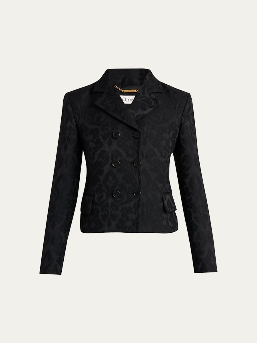 Designed in an ornamental wool-blend jacquard, this top coat by Chloe is finished with tonal buttons for a sophisticated silhouette Notched lapels; double-breasted front Padded shoulders Long sleeves; button cuffs Hip flap pockets Double-vented vamp Tailored fit Hip length Wool/polyester Lining: Viscose/cotton Dry clean, professional cleaning recommended Made in Italy Online Inquiries: BGS21_BB1KV| Store Inquiries: #5439050