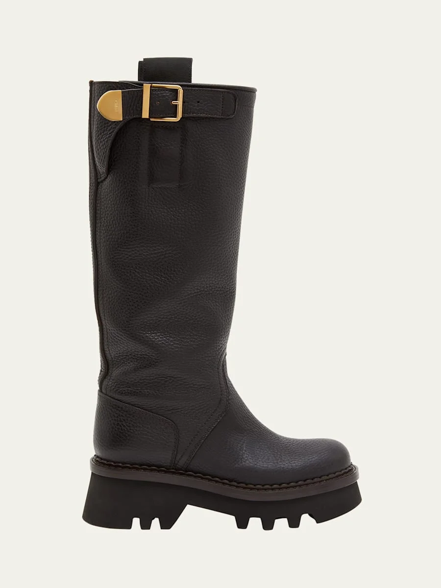 Chloe "Owena" tall boots in grained calf leather 0.75 in / 20 mm flat heel Round toe Adjustable side buckle Pulltabs at collar Made in Italy