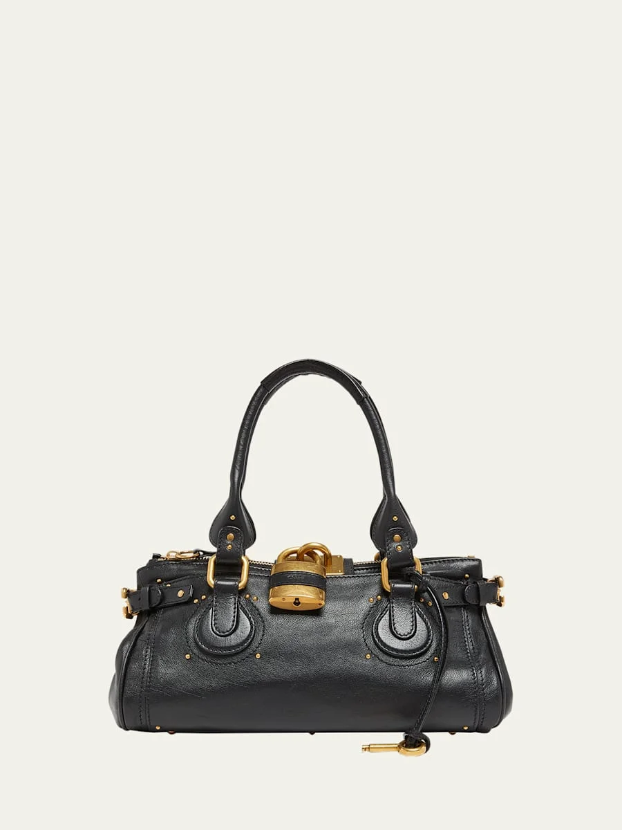 Crafted of soft leather, the 'Paddington" shoulder bag from Chloe features side buckle straps for a cinched shape and a detachable key charm. Tiny metallic studs dot the surface, adding a refined finish. Rolled top handles Zip top with padlock-embellished strap Interior, one zip pocket Lining: Cotton Approx. 7"H x 14.7"W x 7"D Made in Italy Online Inquiries: BGS21_V6R17| Store Inquiries: #5358301
