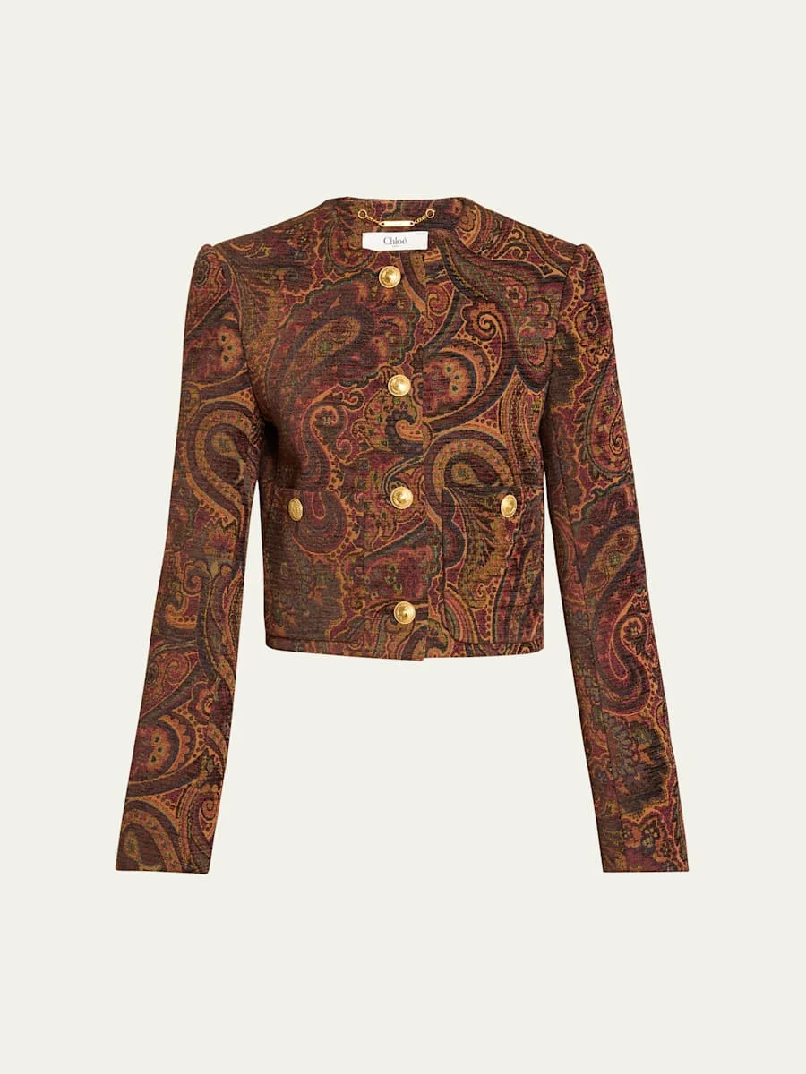 Chloe collarless jacket in a paisley velvet jacquard with goldtone buttons Round neckline; single-breasted front Long sleeves Front button-patch pockets Straight fit Viscose/polyester/cotton Lining: Viscose/cotton Dry clean Imported Online Inquiries: BGS21_BA3CD| Store Inquiries: #5024470