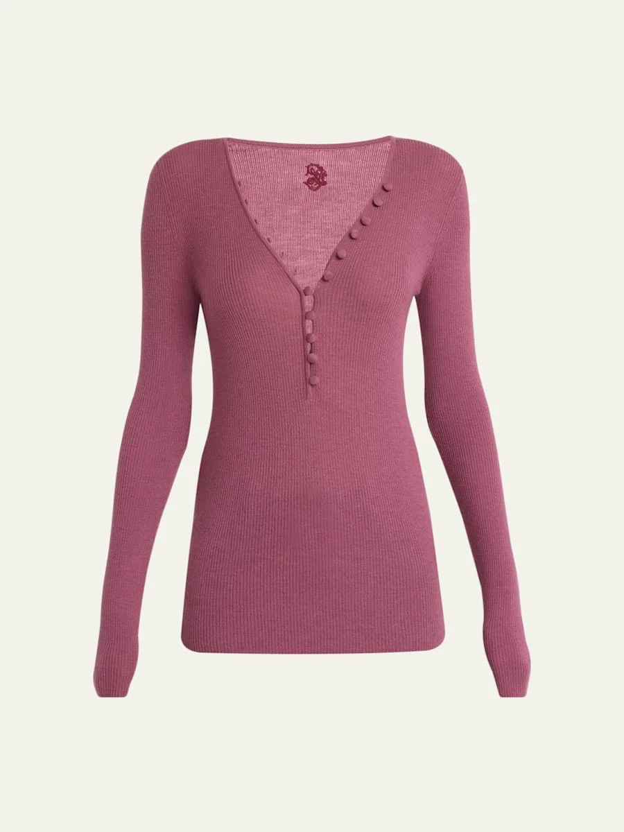 A wardrobe staple, this henley by Chloe is finished with self-covered buttons and a ribbed finish for added textural interest V neckline Long sleeves Slim fit Hip length Pullover style Wool Dry clean, professional cleaning recommended Imported Online Inquiries: BGS21_BB1HP| Store Inquiries: #5438571
