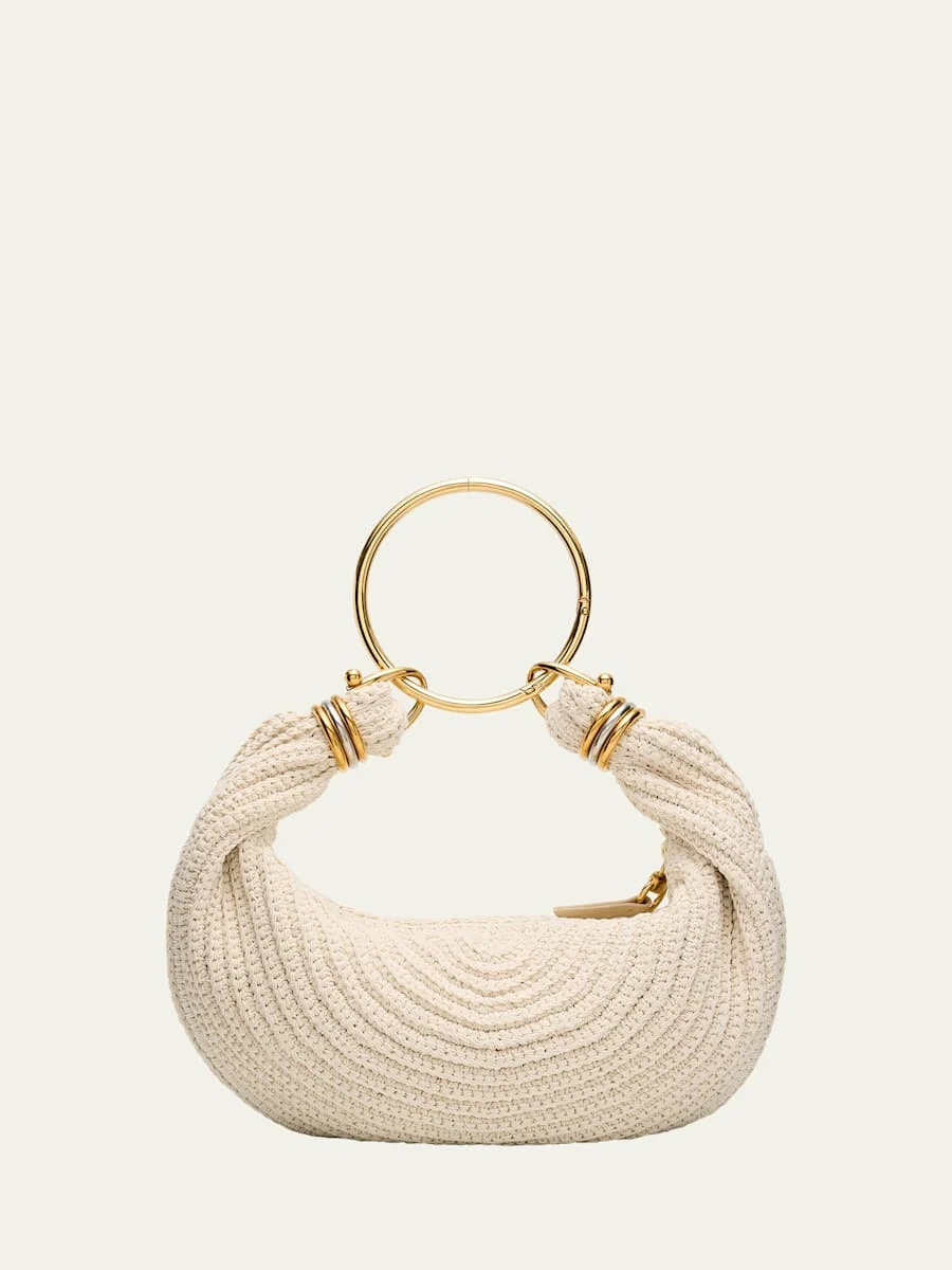 Inspired by archive designs, this Chloe bracelet hobo bag features a supple, rounded shape elevated by the stacked bicolor rings on each end Crocheted by hand in acrylic in a process that takes around 8 hours Detachable bracelet top handle Detachable, adjustable shoulder strap Can be worn as a top handle or shoulder bag Zip top closure Interior, one slip pocket Lining: Leather Approx. 5.5"H x 12.6"W x 3.9"D Made in Italy Online Inquiries: BGS21_V6JEU| Store Inquiries: #5015123