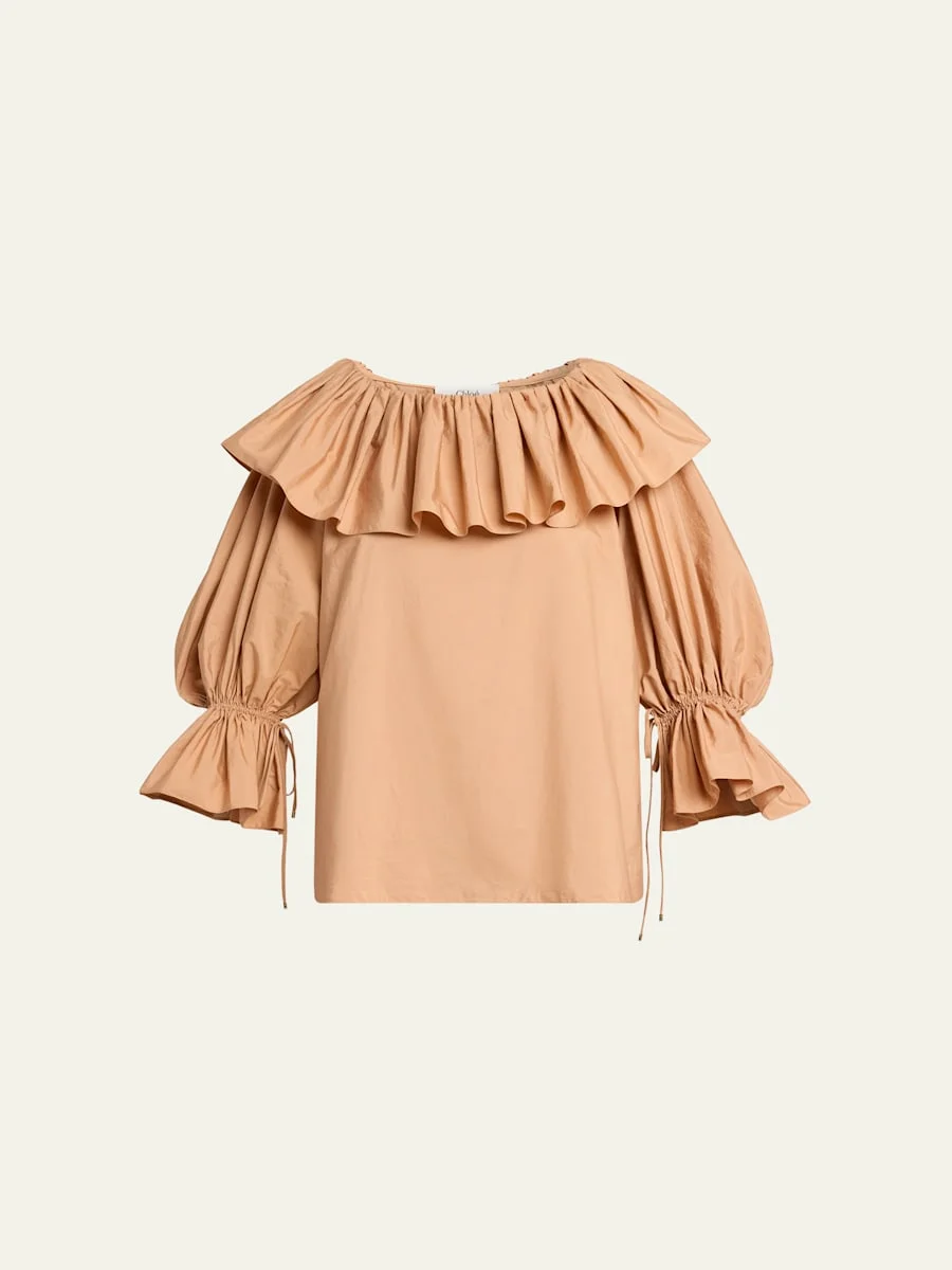 Crafted from crisp cotton poplin, this top from Chloe features a ruffle that drapes along the neckline and voluminous sleeves with drawstring ruffle cuffs High neckline 3/4 balloon sleeves Selftie ruffle cuffs Loose fit Pullover style Cotton Professional cleaning recommended Imported SIZE amp; FITModel measurements: 5'10" tall Model is wearing a US size 4/Small