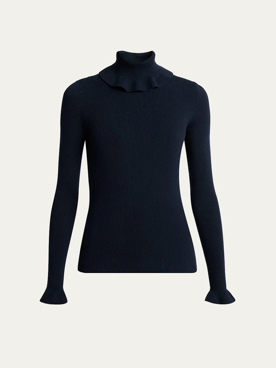 Chloe ribbed knit sweater featuring ruffled edges Turtleneck Long sleeves Fitted Pullover style Cotton/wool Dry clean Made in Italy Online Inquiries: BGS21_BA888| Store Inquiries: #5051237