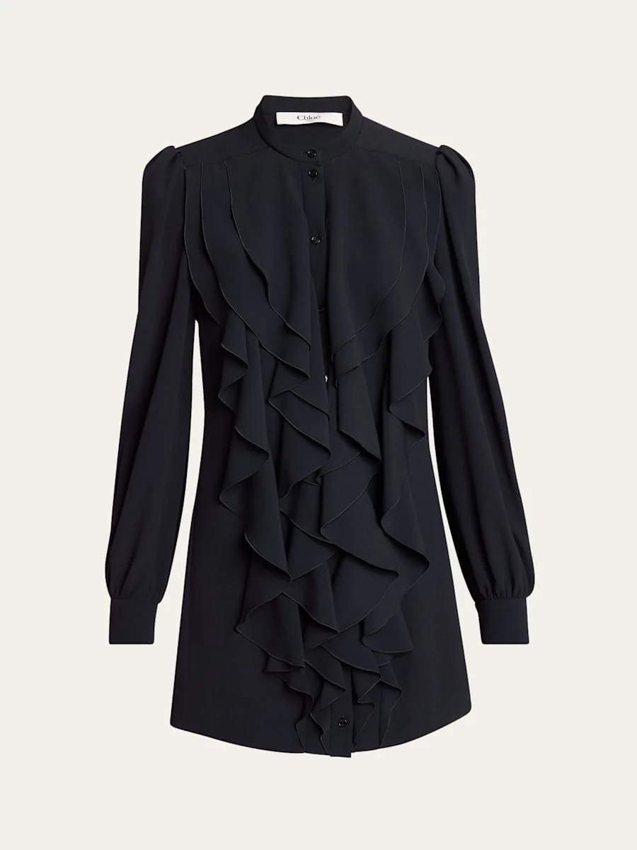 Chloe dress featuring cascading ruffles on the front Band collar; button cuffs Long sleeves; button cuffs Shift silhouette Mini length Acetate/silk Dry clean Made in Italy Online Inquiries: BGS21_BA3C8| Store Inquiries: #5024465