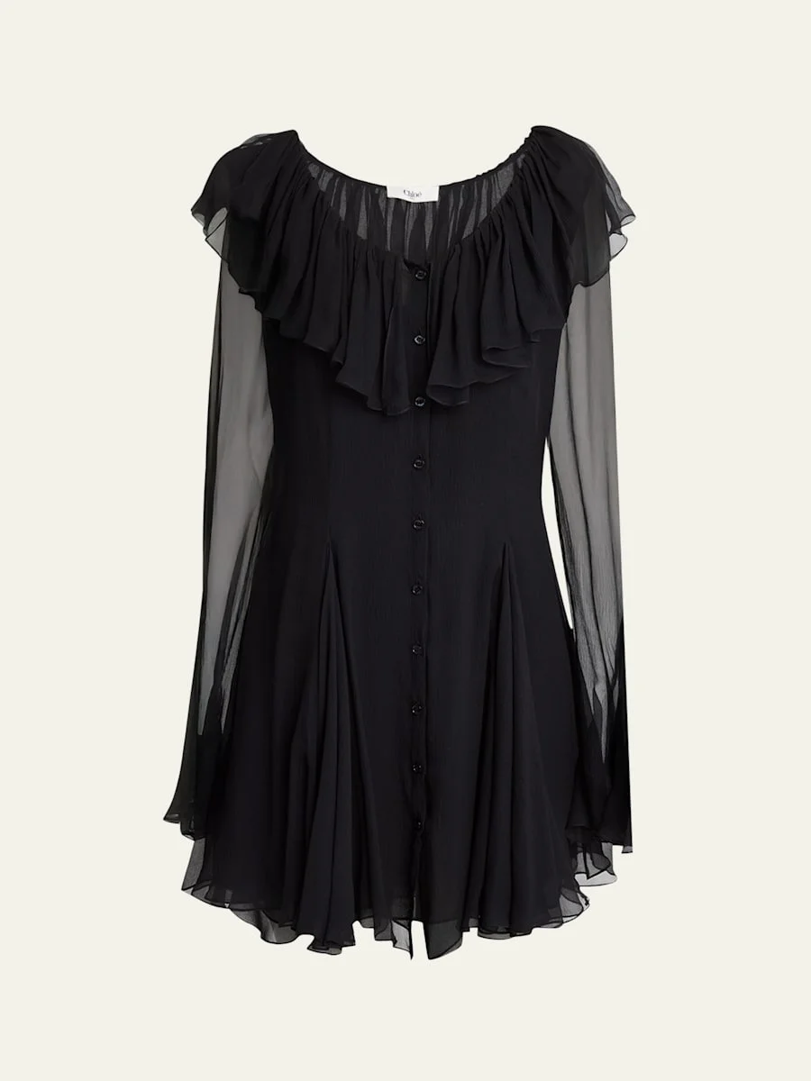 Ruffle Long-Sleeve Silk Mousseline Mini Dress