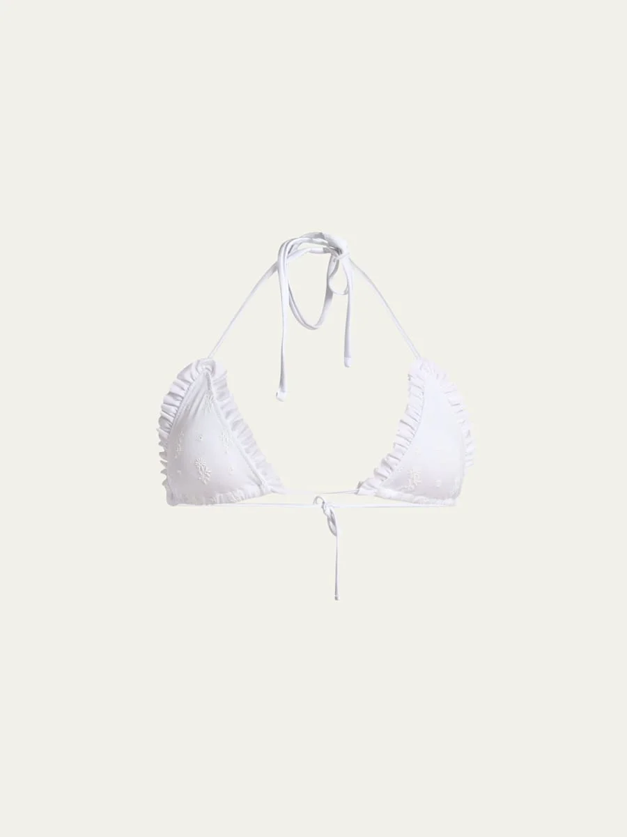 Chloe bikini top detailed with tonal eyelet embroidery and ruffle trim Halter neckline; self-ties behind the neck Triangle cups slide on string Mid-back self-ties Nylon/polyamide/elastane Lining: Nylon/elastane Dry clean Made in Italy Online Inquiries: BGS21_BA3D1| Store Inquiries: #5024494