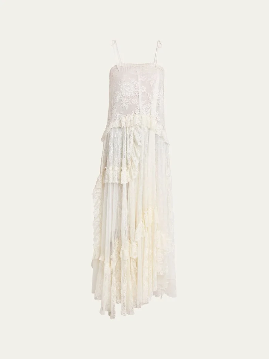 Chloe maxi dress constructed in floral lace with scalloped ruffle trim Elasticized square neckline Sleeveless Self-tie shoulder straps Full length A-line silhouette Slipover style Cotton/nylon/polyamide Lining: Silk Dry clean Made in France Online Inquiries: BGS21_BA3D4| Store Inquiries: #5024497