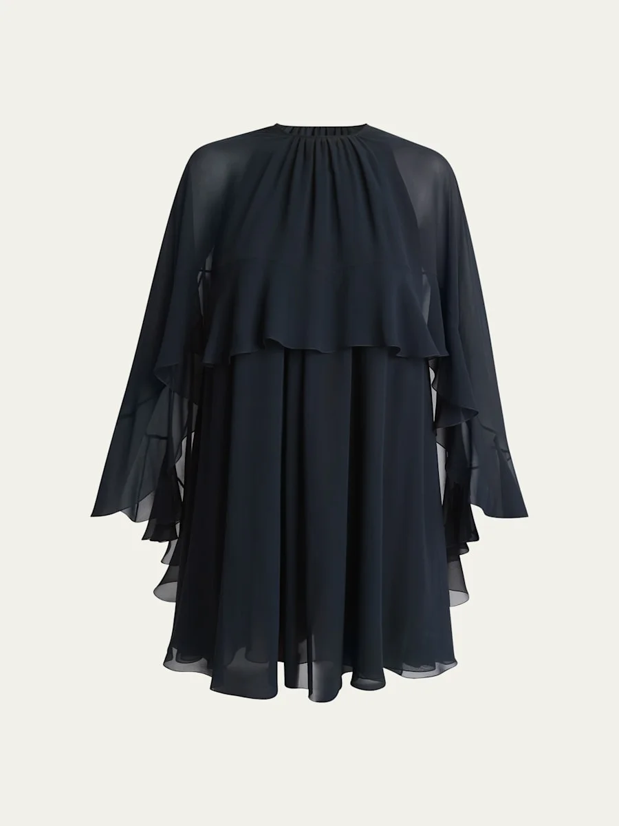 Ruffled Three-Quarter Sleeve Silk Georgette Mini Dress