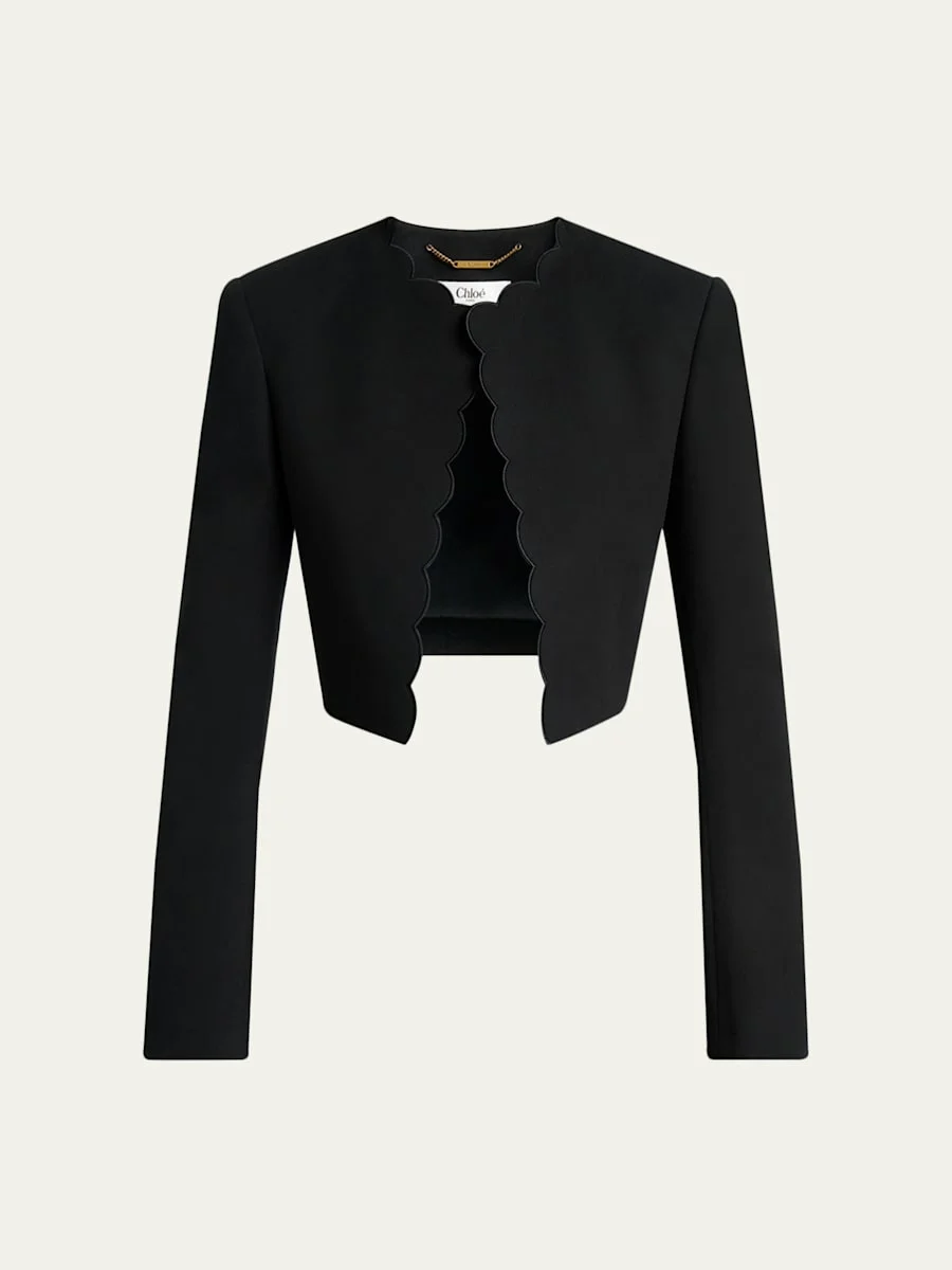 Chloe jacket is crafted from a soft calvary cotton finished with scalloped edges Round neck; open front Long sleeves Padded shoulders Slim fit Cropped length Cotton/elastane/polyester Lining: Viscose/cotton Dry clean Imported Online Inquiries: BGS21_BB3X0| Store Inquiries: #5485537