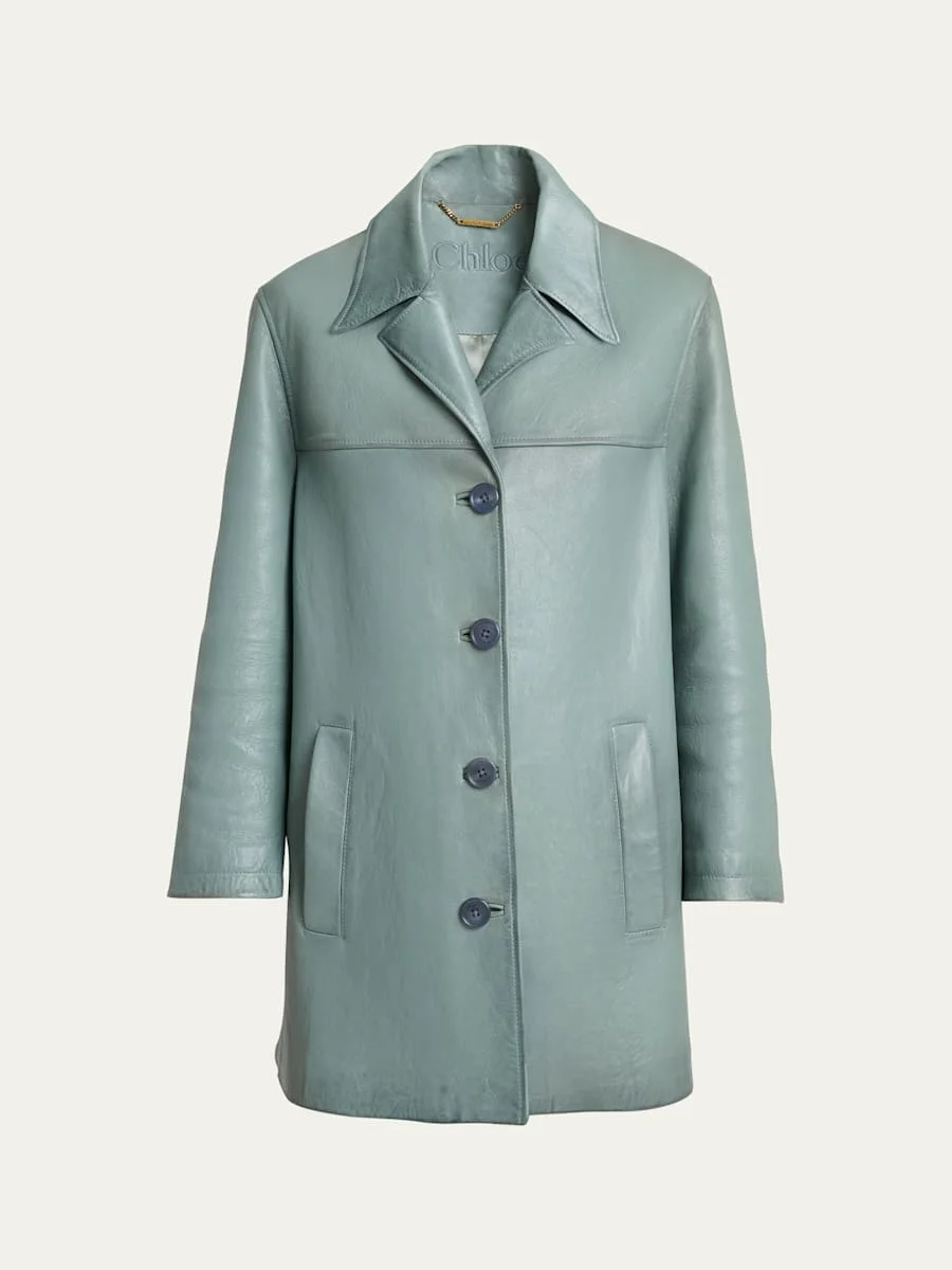 Chloe coat is crafted from a shiny vintage waxed lambskin leather accented with water buffalo buttons (India) Cuban collar; singlebreasted front Long sleeves Chets yoke Hip welt pockets Straight it Hem falls below the hip Button closure Leather Lining: Cupro Dry clean Made in Italy
