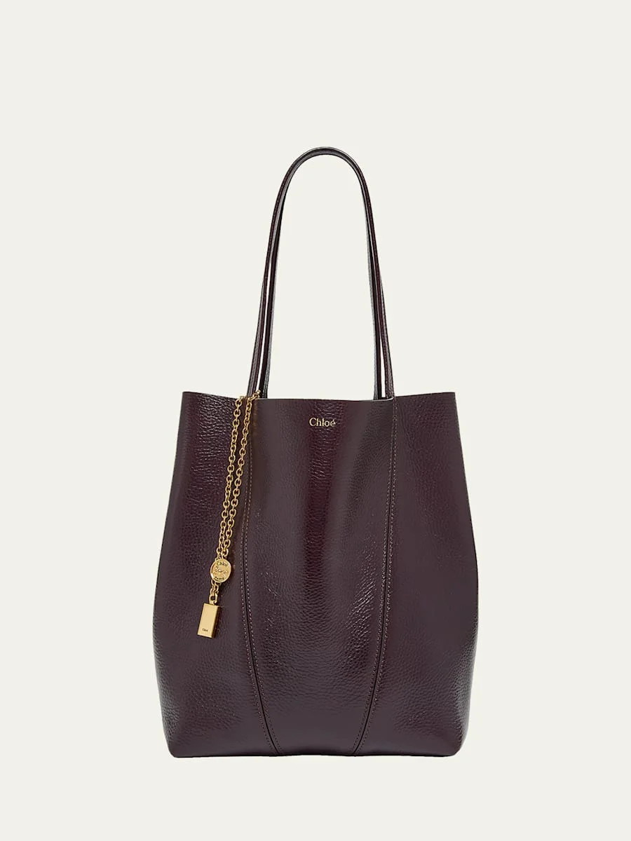 Chloe "Spin" tote bag in shinygrained leather Shoulder straps with charm chain strap Open top Lining: Leather Approx. 11.8"H x 10.6"W x 5.5"D Professional cleaning recommended Made in Italy