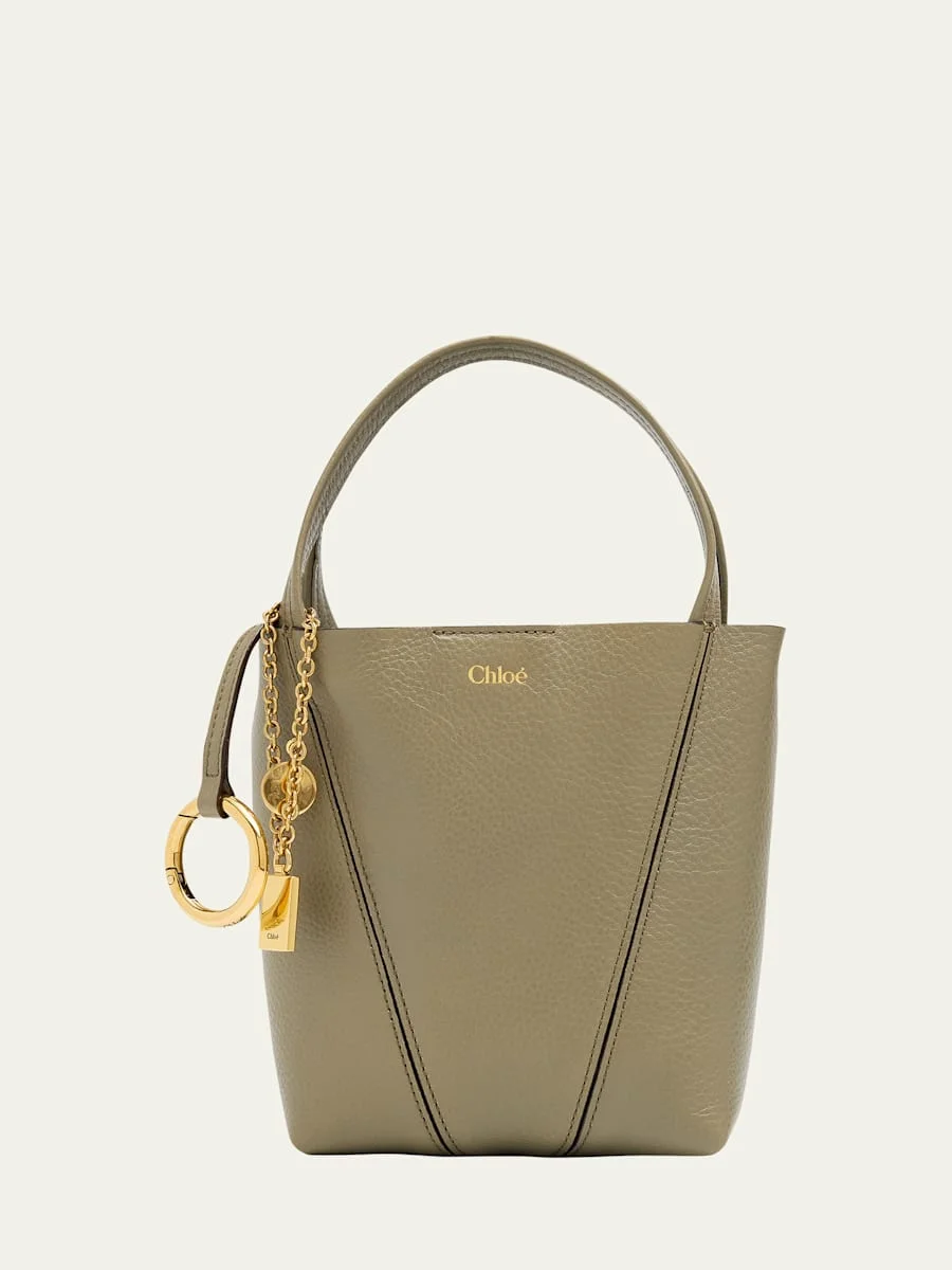 Chloe "Spin" tote bag in grained calfskin leather Top handles with charm chain strap Removable, adjustable crossbody strap Can be worn as a top handle or crossbody bag Open top with magnetic closure Lining: Leather Approx. 7.4"H x 7"W x 3.1"D Professional cleaning recommended Made in Italy