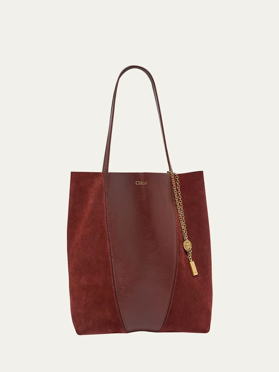 This Chloe "Spin" tote bag combines grained buffalo leather with smooth calfskin suede, featuring a dangling chain charm with the signature Chloe and Horse medals Flat shoulder straps, 9.1" drop Ring strap gathering for top-handle carry Open top Approx. 11.8"H x 10.6"W x 5.5"D Professional cleaning recommended Made in Italy Online Inquiries: BGS21_V6RK2| Store Inquiries: #5373306