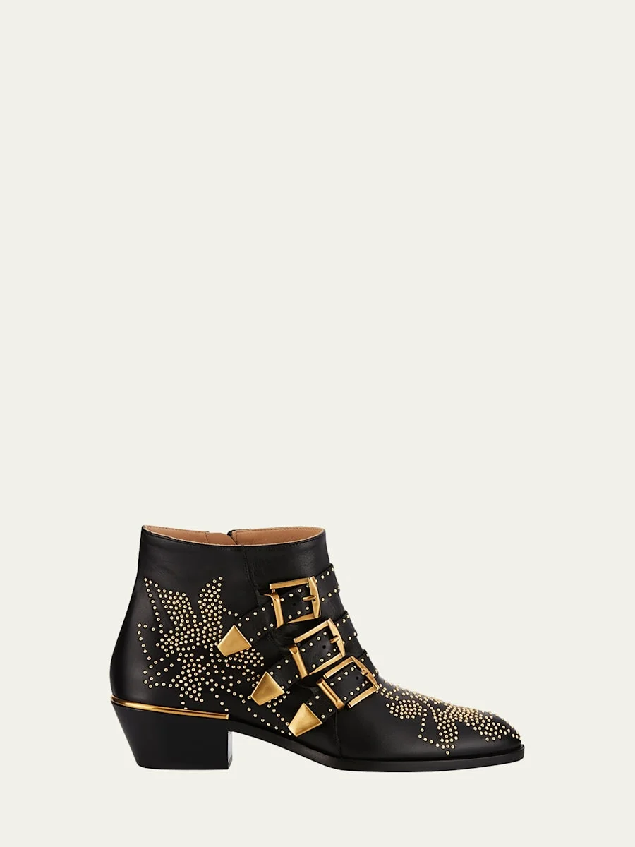 Chloe "Susanna" studded leather boot. 1.3" block heel. Almond toe. Three adjustable buckle straps. Side zip eases dress. Made in Italy. Online Inquiries: BGS21_X5QRL| Store Inquiries: #1841908
