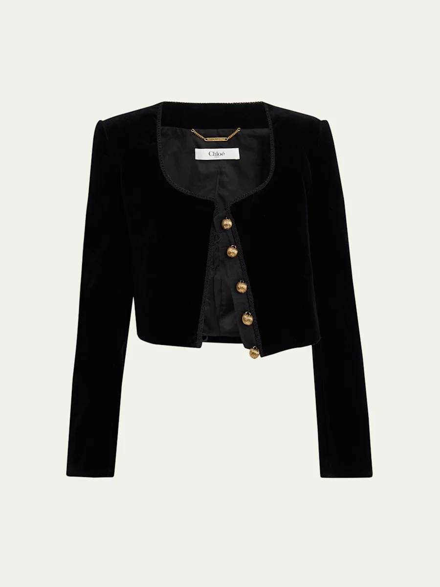 Crafted from plush velvet with gold-tone ball buttons, this top coat by Chloe is framed with structured shoulders for a sophisticated silhouette Collarless neckline Long sleeves Relaxed fit Cropped hem Button-and-loop front closure Cotton/viscose Lining: Viscose/cotton Dry clean, professional cleaning recommended Made in Italy Online Inquiries: BGS21_BAZTZ| Store Inquiries: #5359220