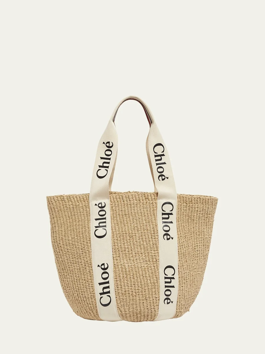 Chloe "Woody" tote bag in fair-trade straw-like paper and leather Made with upcycled materials by craftswomen in Kenya Branded shoulder straps Open top Interior, logo patch Unlined Approx. 18.9"H x 11"W x 11"D Professional cleaning recommended Made in Italy Online Inquiries: BGS21_V59NF| Store Inquiries: #4196512