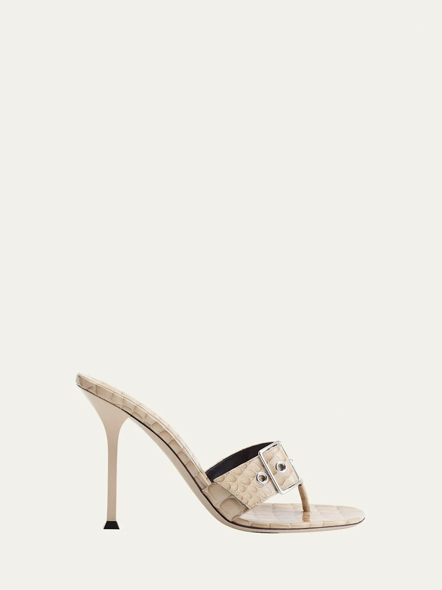 Christen "Helix" crocodile-embossed leather sandals with a buckle strap accent 3.75 in / 95 mm stiletto heel Thong strap Easy slide style Leather/Rubber outsole Lining: Goat leather Made in Italy Online Inquiries: BGS21_X6VUT| Store Inquiries: #5003799