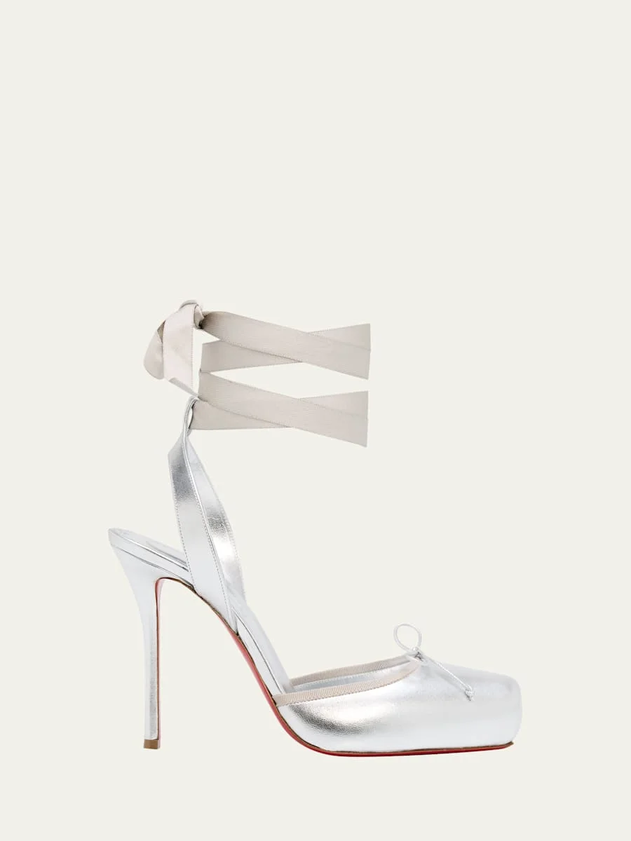 Inspired by ballet slippers, the "Cassia" laceup pump by Christian Louboutin is crafted of metallic leather enhanced by a grosgrain trim. 4.00 in / 100 mm stiletto heel Square toe Slingback support with adjustable ankle ties Signature Louboutin red leather outsole Made in Italy