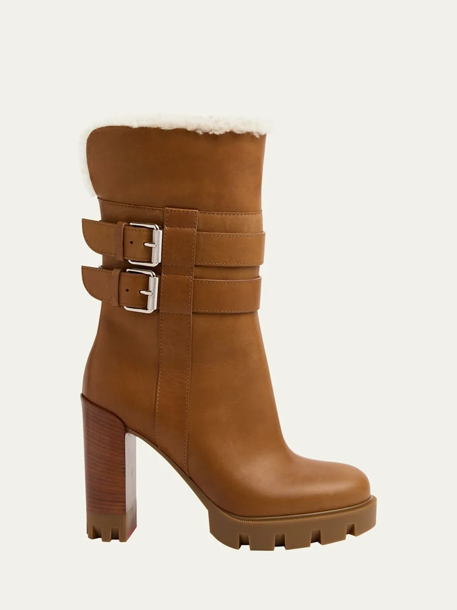Lined with bleached sheep shearling (Italy) for added warmth and comfort, the "Elisawalk" ankle boots by Christian Louboutin are crafted from smooth leather atop a tonal lug sole. 4.00 in / 100 mm wooden block heel Round toe Dual adjustable buckle straps Pull-on style Signature Louboutin red leather outsole Made in Italy Online Inquiries: BGS21_X6ZBH| Store Inquiries: #5070068