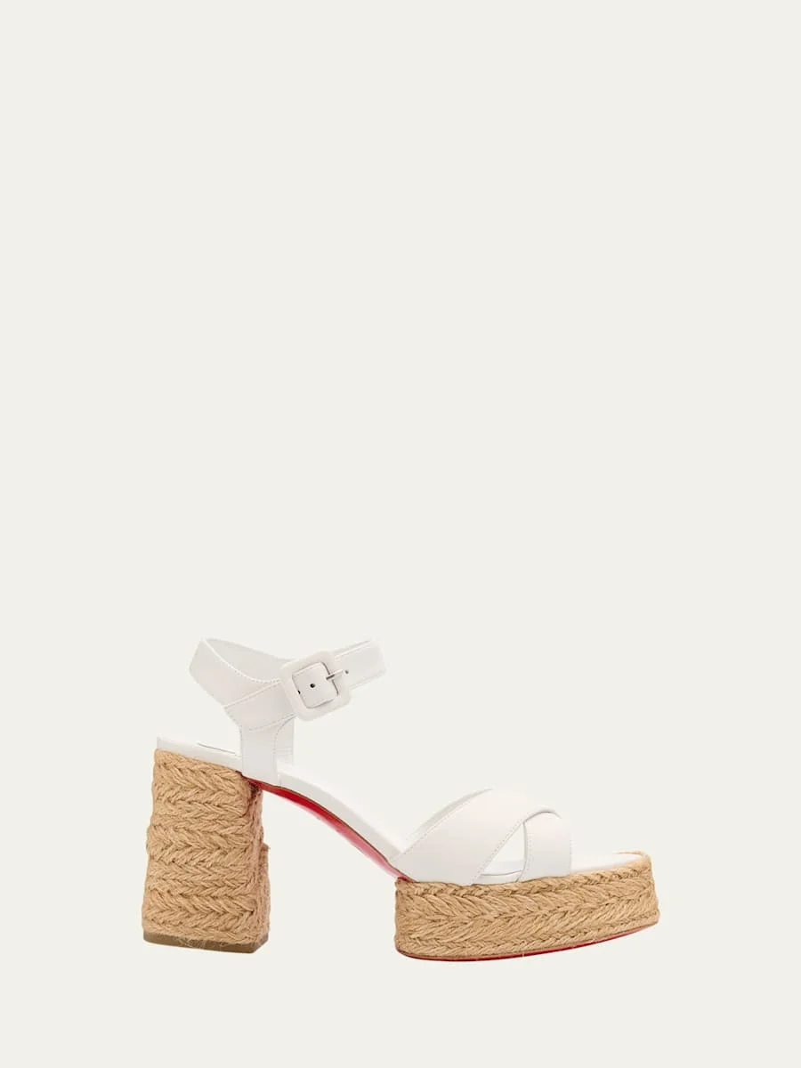Christian Louboutin leather platform espadrille sandals 2.75 in / 70 mm braidedjute block heel Open toe Crisscross vamp Adjustable ankle strap Signature red leather outsole Made in Spain