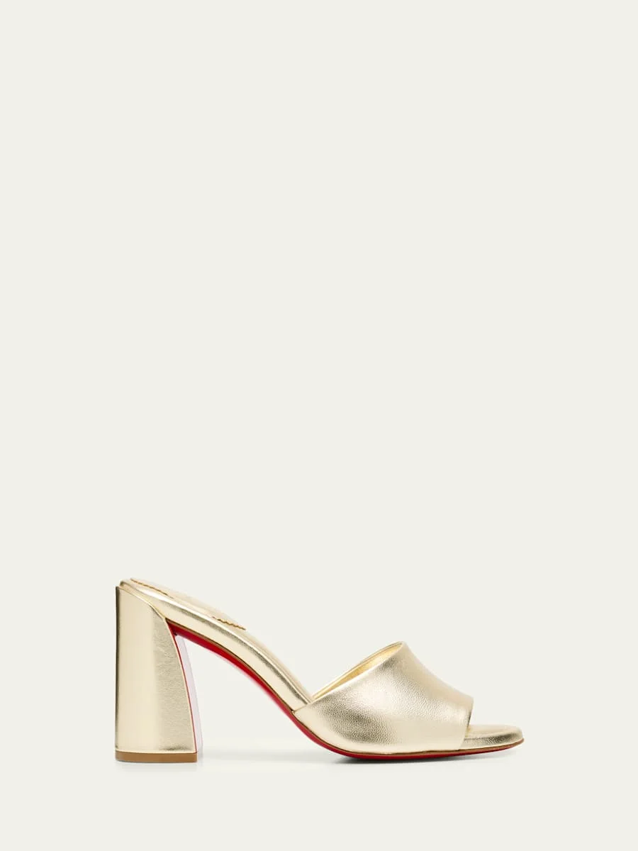 The "Jane" sandals by Christian Louboutin are crafted from metallic nappa leather 3.25 in / 85 mm covered block heel Open toe Wide band upper Easy slide style Signature Louboutin red leather outsole Made in Italy Online Inquiries: BGS21_X6ZBV| Store Inquiries: #5070086