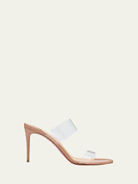 Christian Louboutin clear PVC and patent leather mule sandals 3.25 in / 85 mm stiletto heel Open toe Two band upper Slide style Lining: Leather Signature red leather outsole Made in Italy