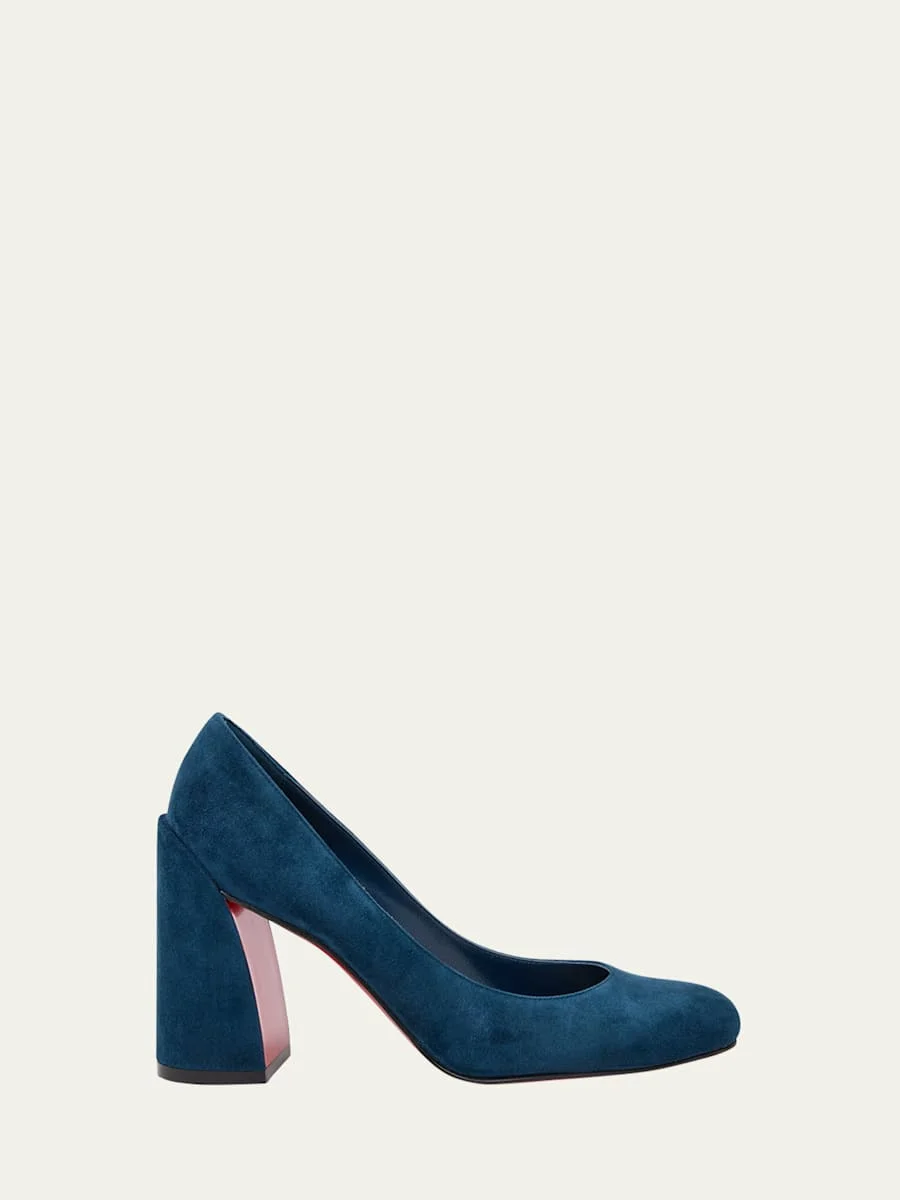 Designed in supple calf suede, the "Miss Sab" pumps by Christian Louboutin sit atop a thick block heel for a comfortable fit 3.25 in / 85 mm covered block heel Round toe Slipon style Signature Louboutin red leather outsole Made in Italy