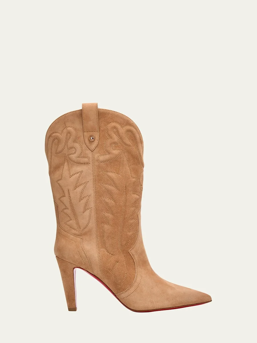 Christian Louboutin "Santia" western booties in calf suede with stitch detailing 3.25 in / 85 mm stiletto heel Pointed toe Pull tabs at curved collar Signature Christian Louboutin red leather sole Lining: Unlined Made in Italy