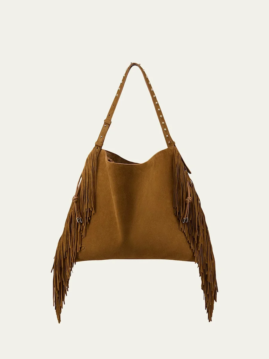 Christian Louboutin baggy tote bag in suede, elevated with cascading fringe and signature metallic spikes Adjustable shoulder straps Open top Interior pouch with drawstring closure and one zip pocket Lining: Leather Approx. 15.4"H x 19.7"W x 2.7"D Made in Italy Online Inquiries: BGS21_V6JGQ| Store Inquiries: #5017399