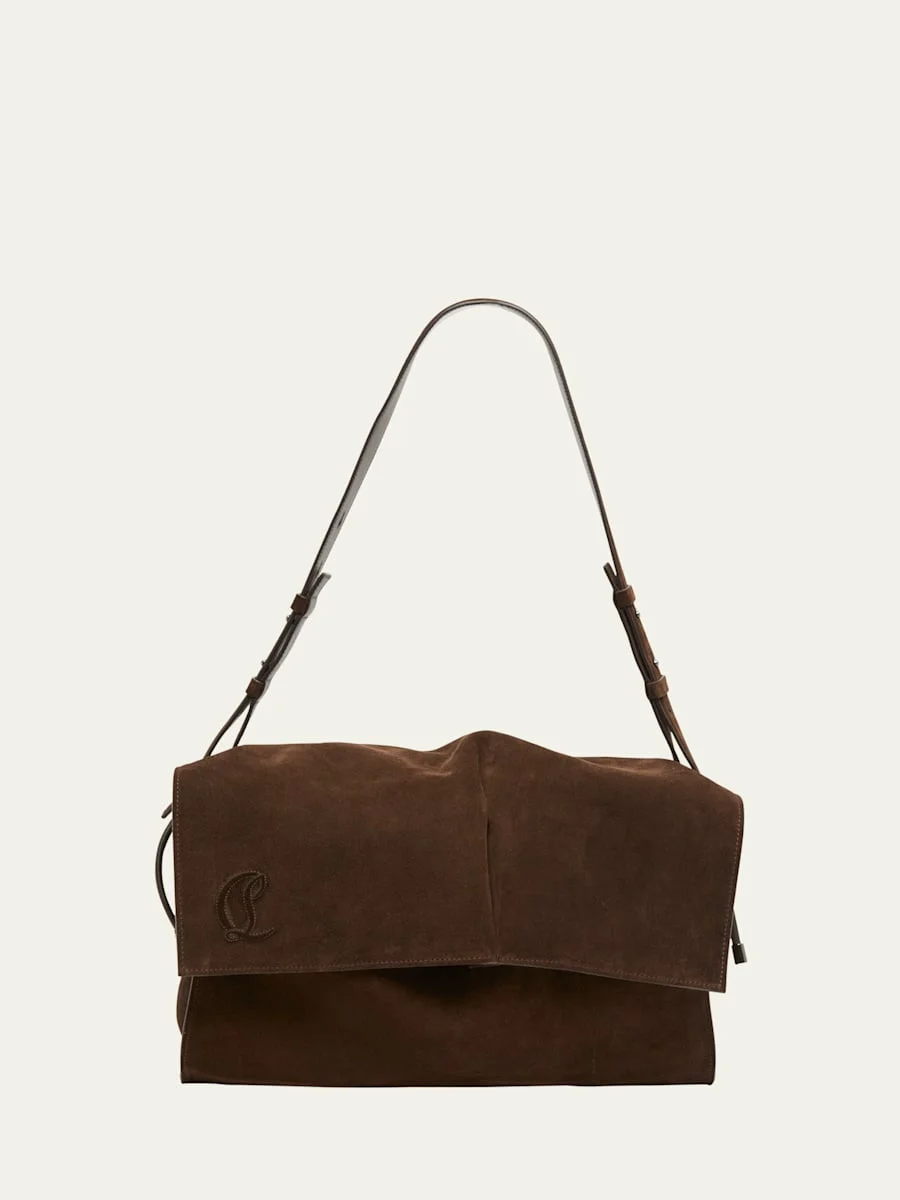 Christian Louboutin "Baggy" shoulder bag in suede Adjustable shoulder strap Flap top with magnetic and drawstring closure Interior, one zip pocket Signature red lining Lining: Leather/leather/cotton Approx. 9.8"H x 14.6"W x 6.1"D Made in Italy Online Inquiries: BGS21_V6G0H| Store Inquiries: #4970466