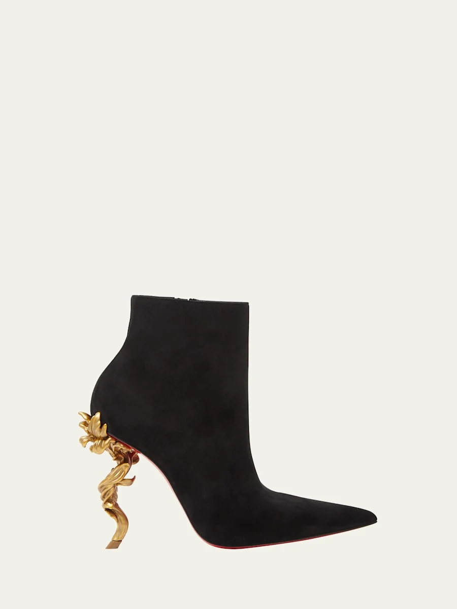 Christian Louboutin soft suede ankle booties 4.00 in / 100 mm golden ornate stiletto heel Pointed toe Side zip eases dress Signature red leather outsole Lining: Satin Made in Italy Online Inquiries: BGS21_X6PBR| Store Inquiries: #4862836